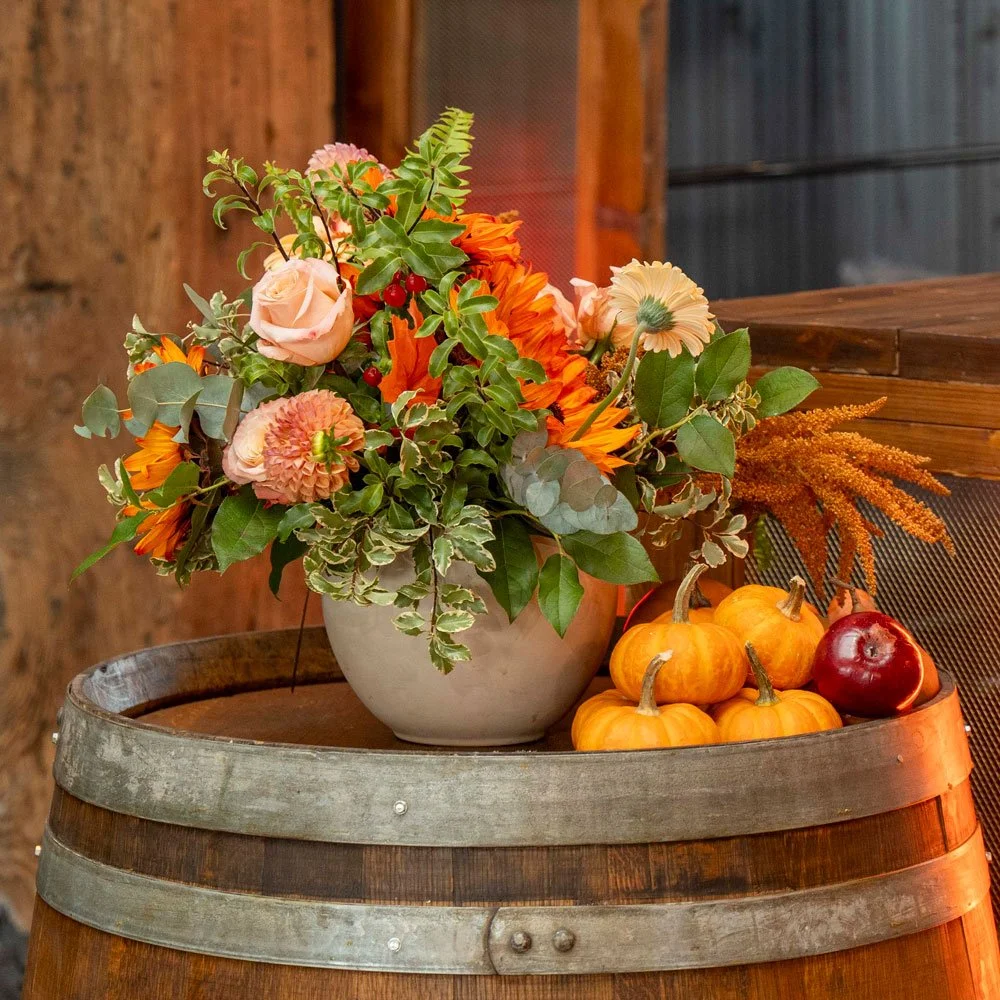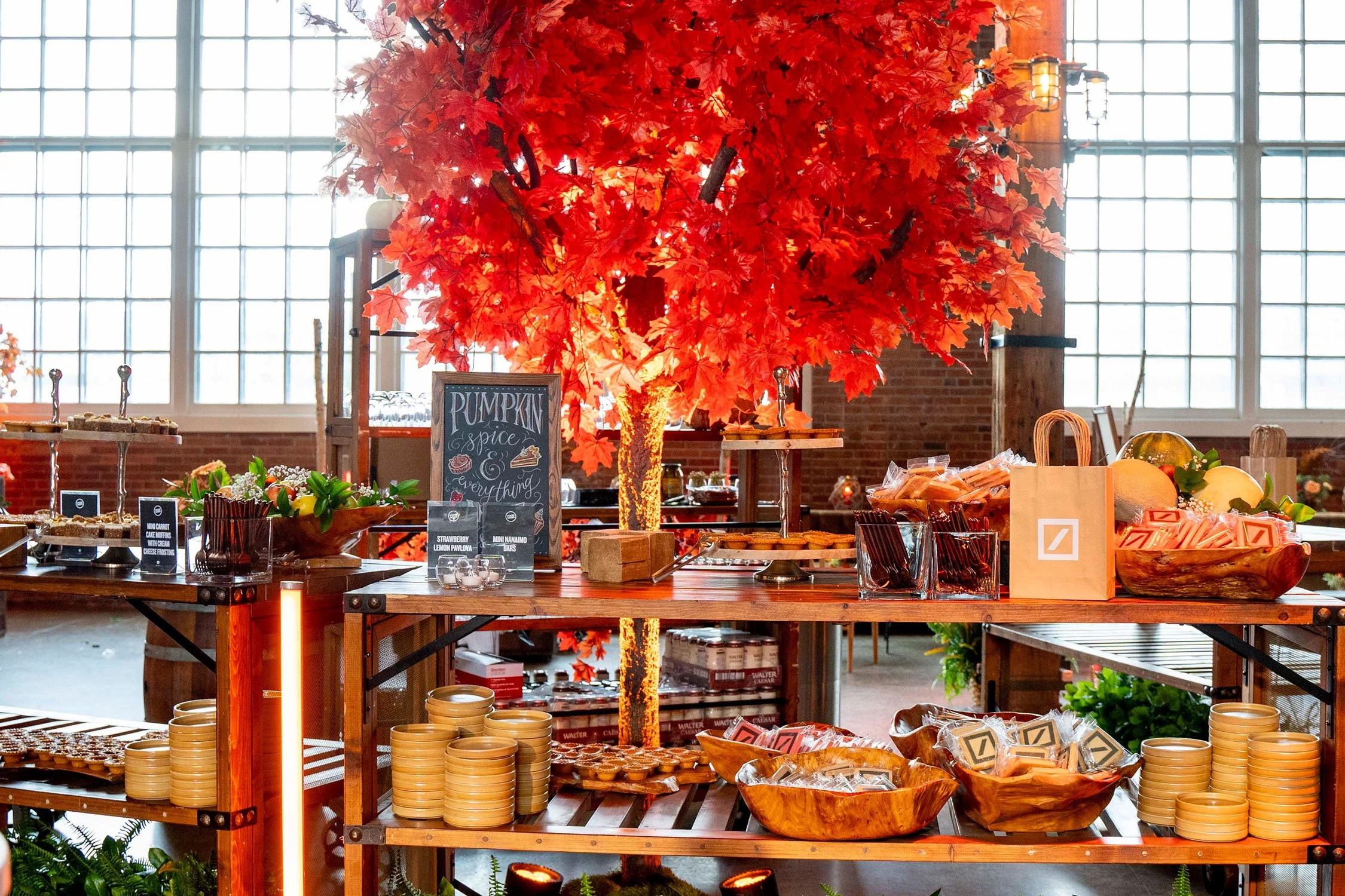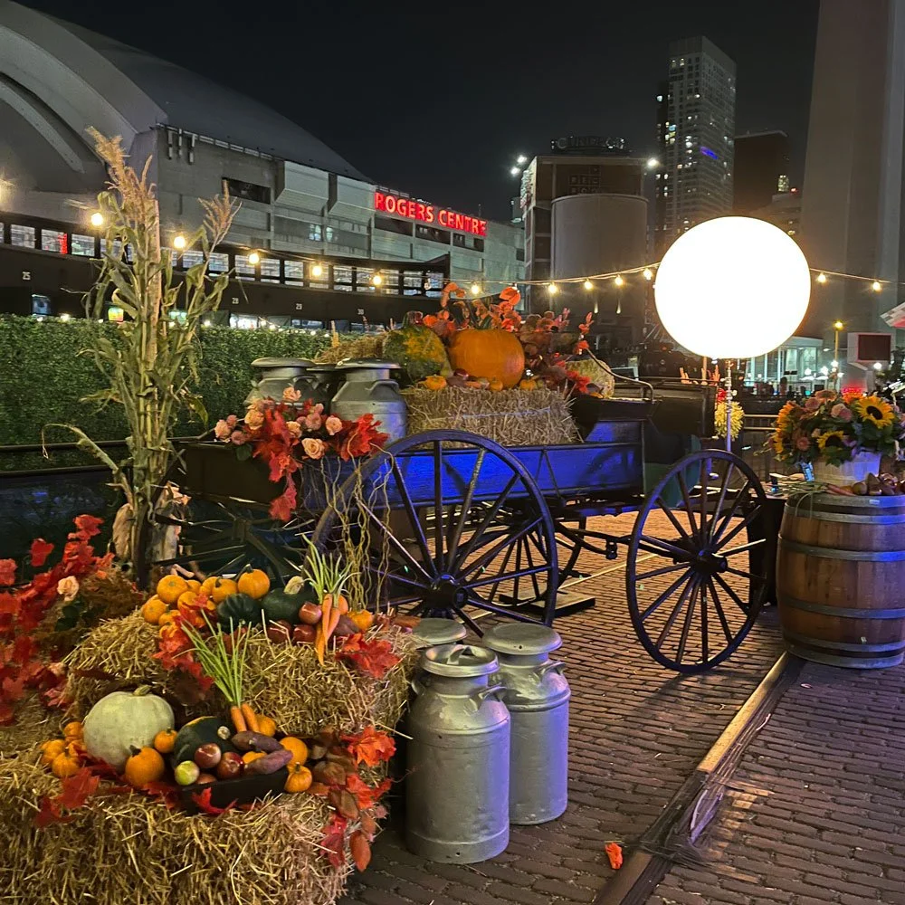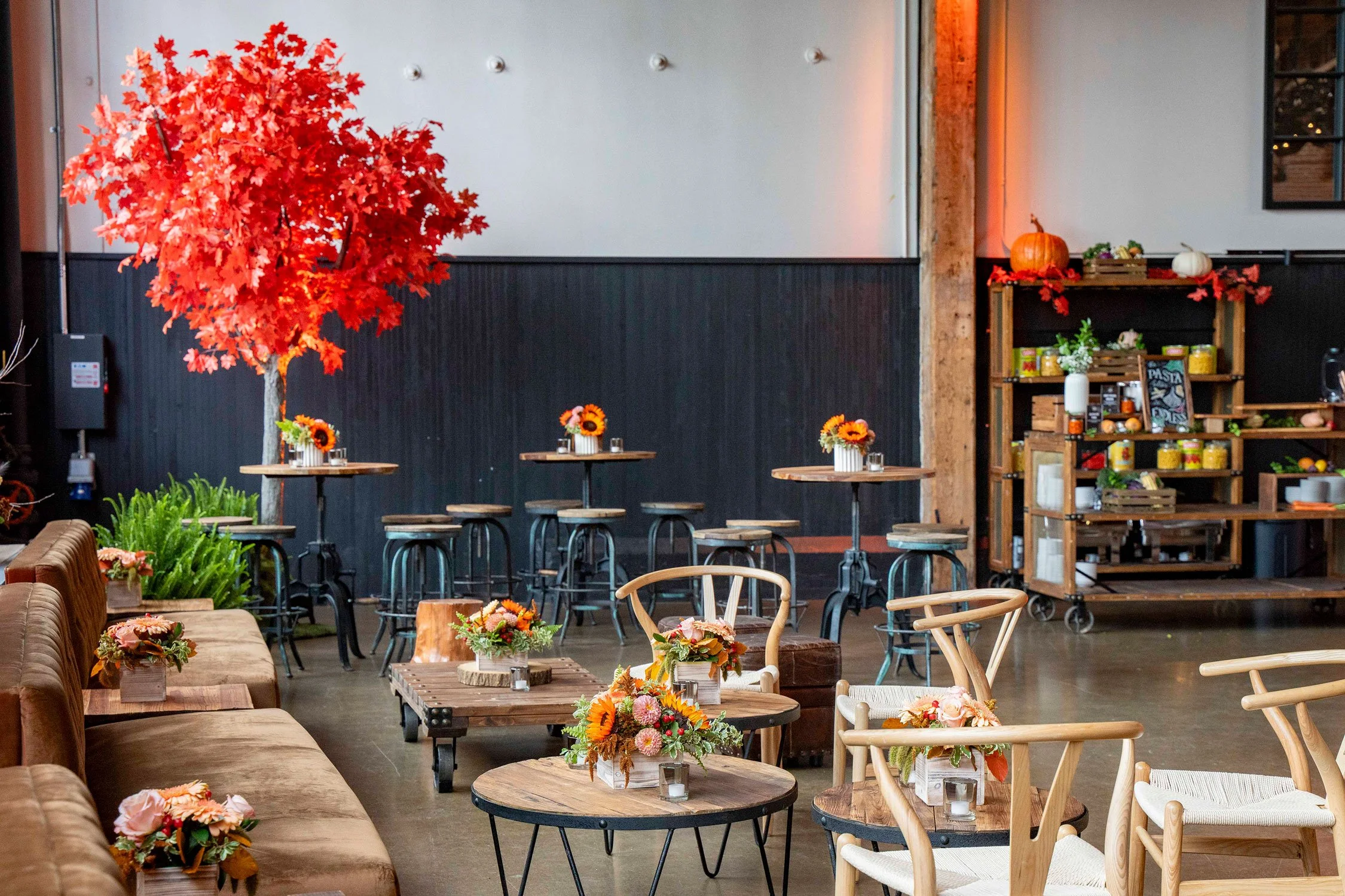 Steam Whistle’s Locomotive Hall transformed into an immersive autumn landscape. Red-leaf trees, golden seating touched with wood elements with vibrant florals, and wood inspired food stations featured custom chalkboard signage filled the space. A decorated wagon out on the patio and floral lined walkways. Seasonal, festive, and full of warmth—an autumn inspired evening brought vividly to life.