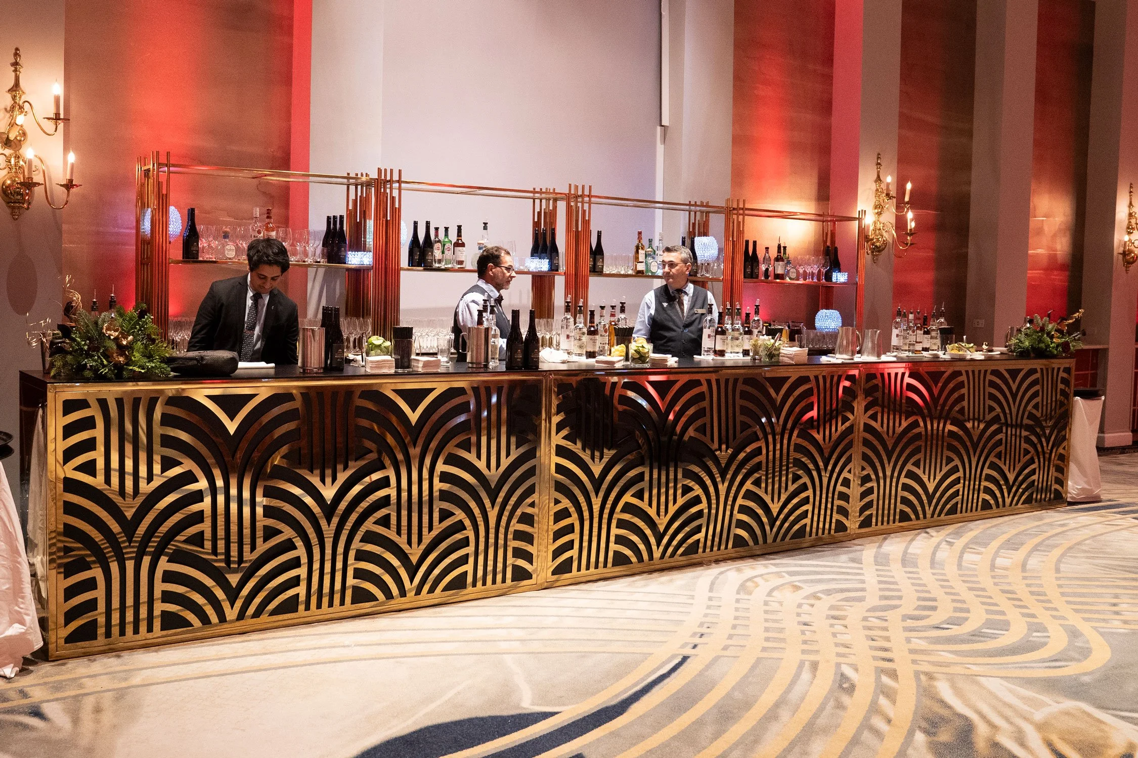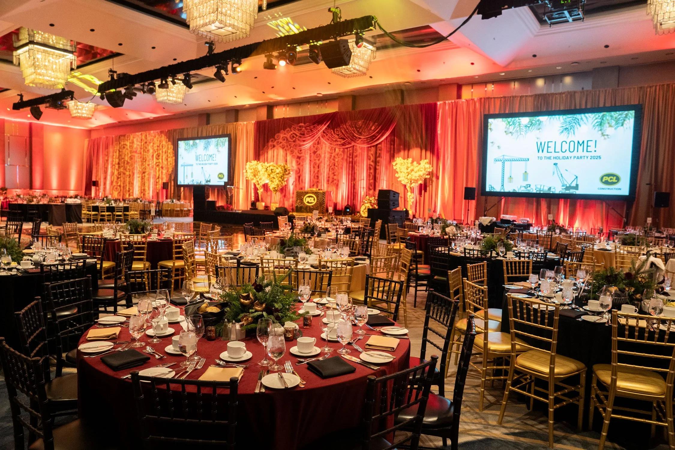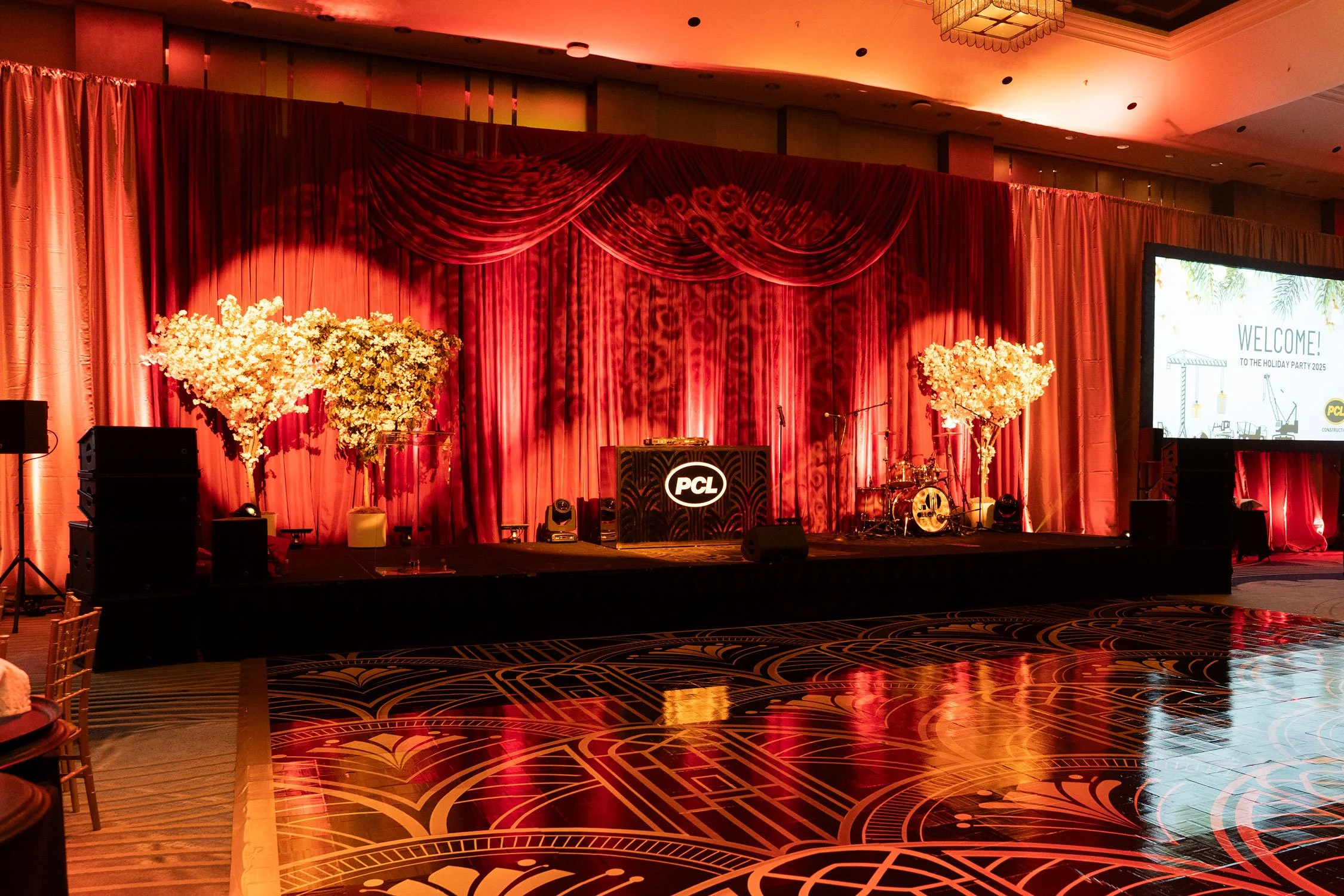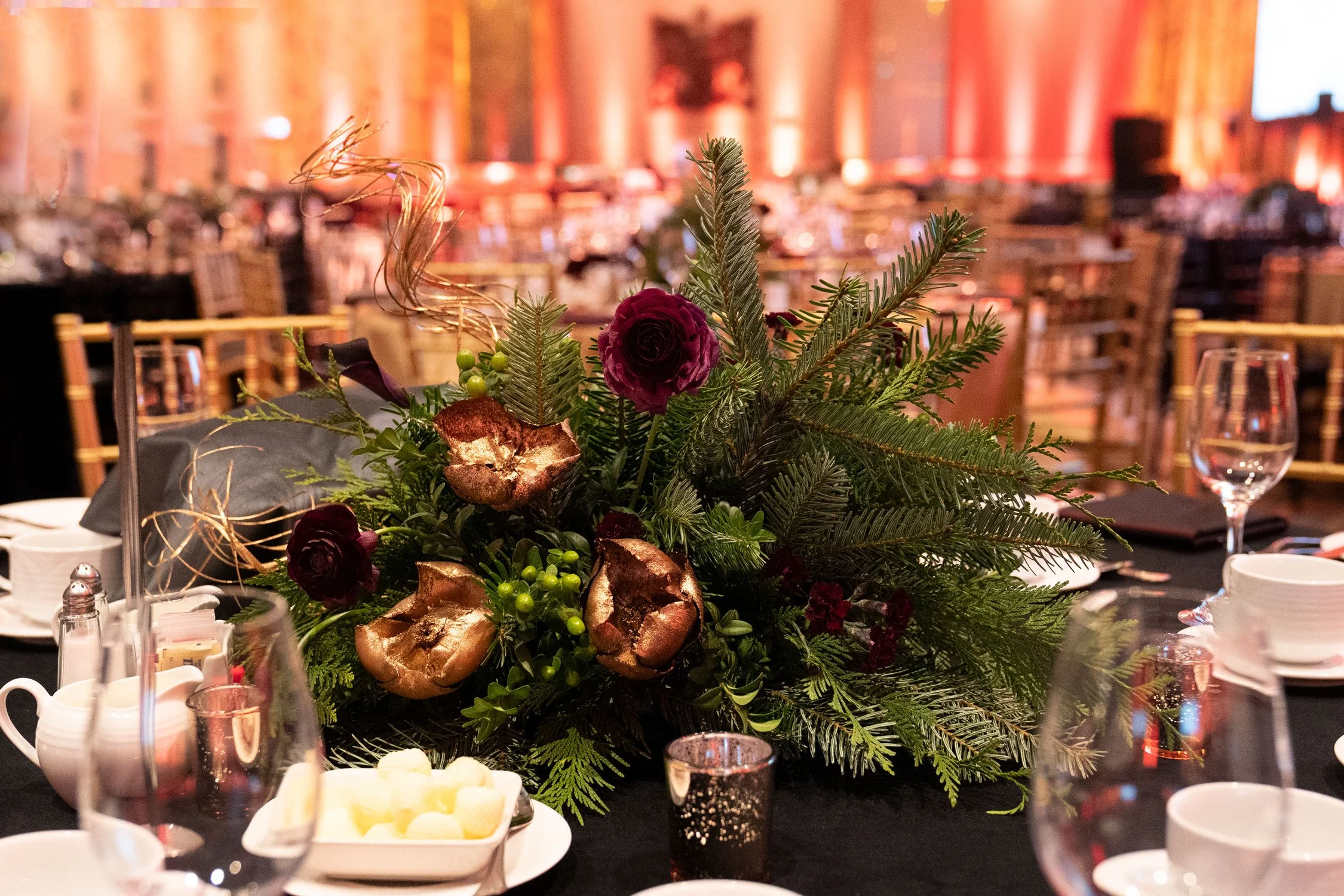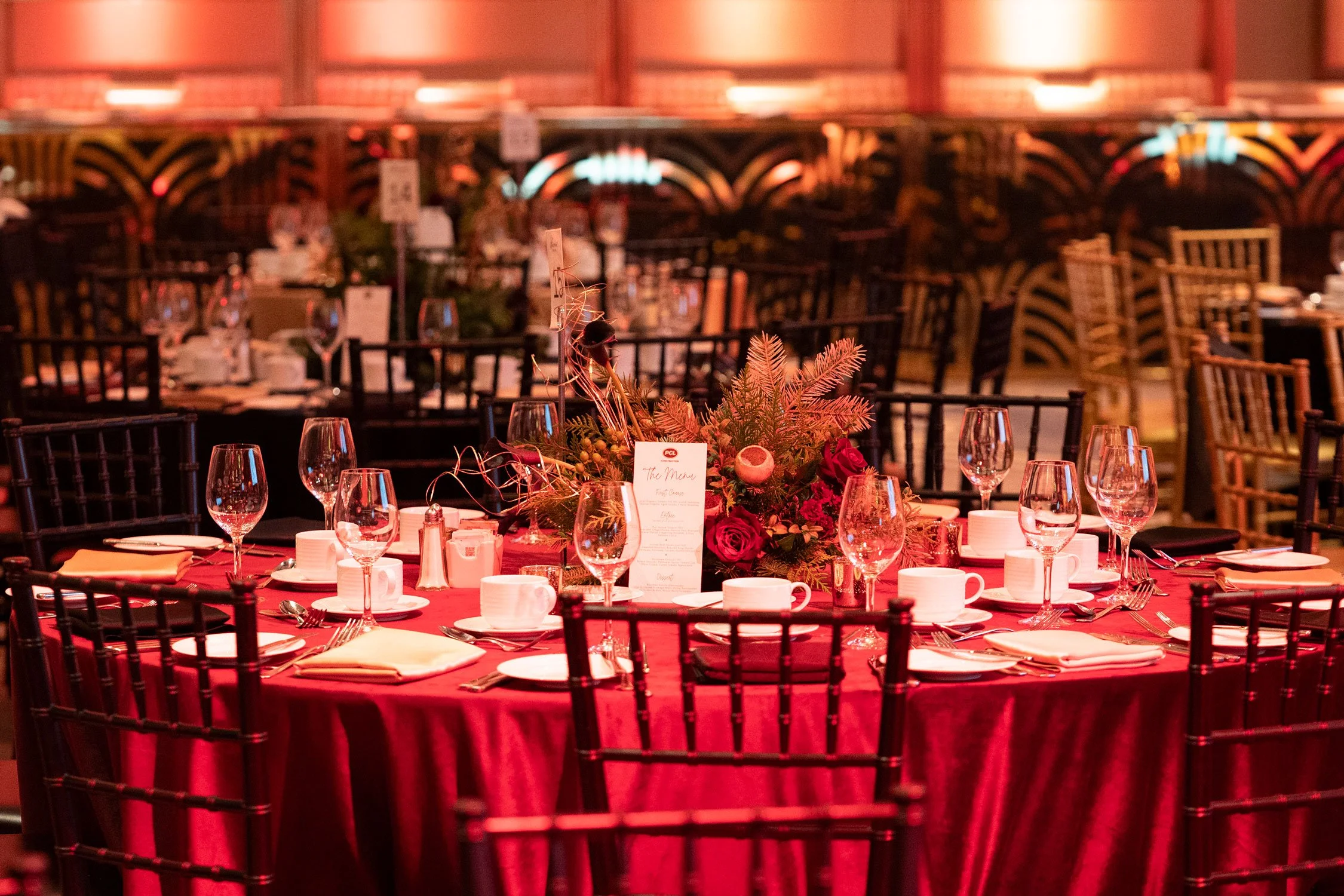 Six hundred and fifty guests gathered in the handsome Canadian Room at the Fairmont Royal York for an annual holiday dinner celebration. Velvet covered dining tables with deco and holiday inspired florals surrounded a glamorous gold Art Deco dance floor and a striking deco-inspired stage set. It all created a dazzling focal point for a festive night of holiday magic—served with a bold dose of Deco glamour.