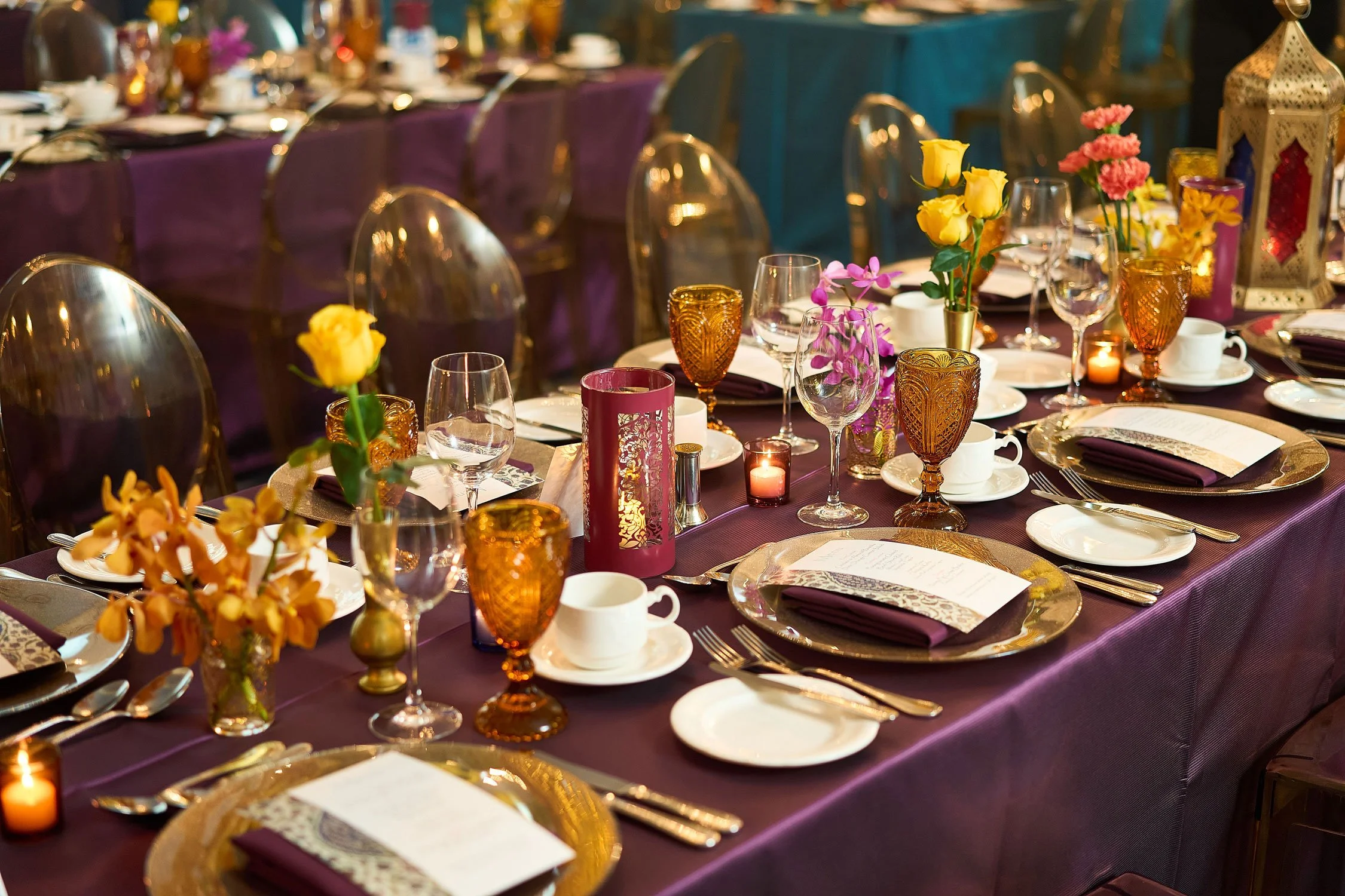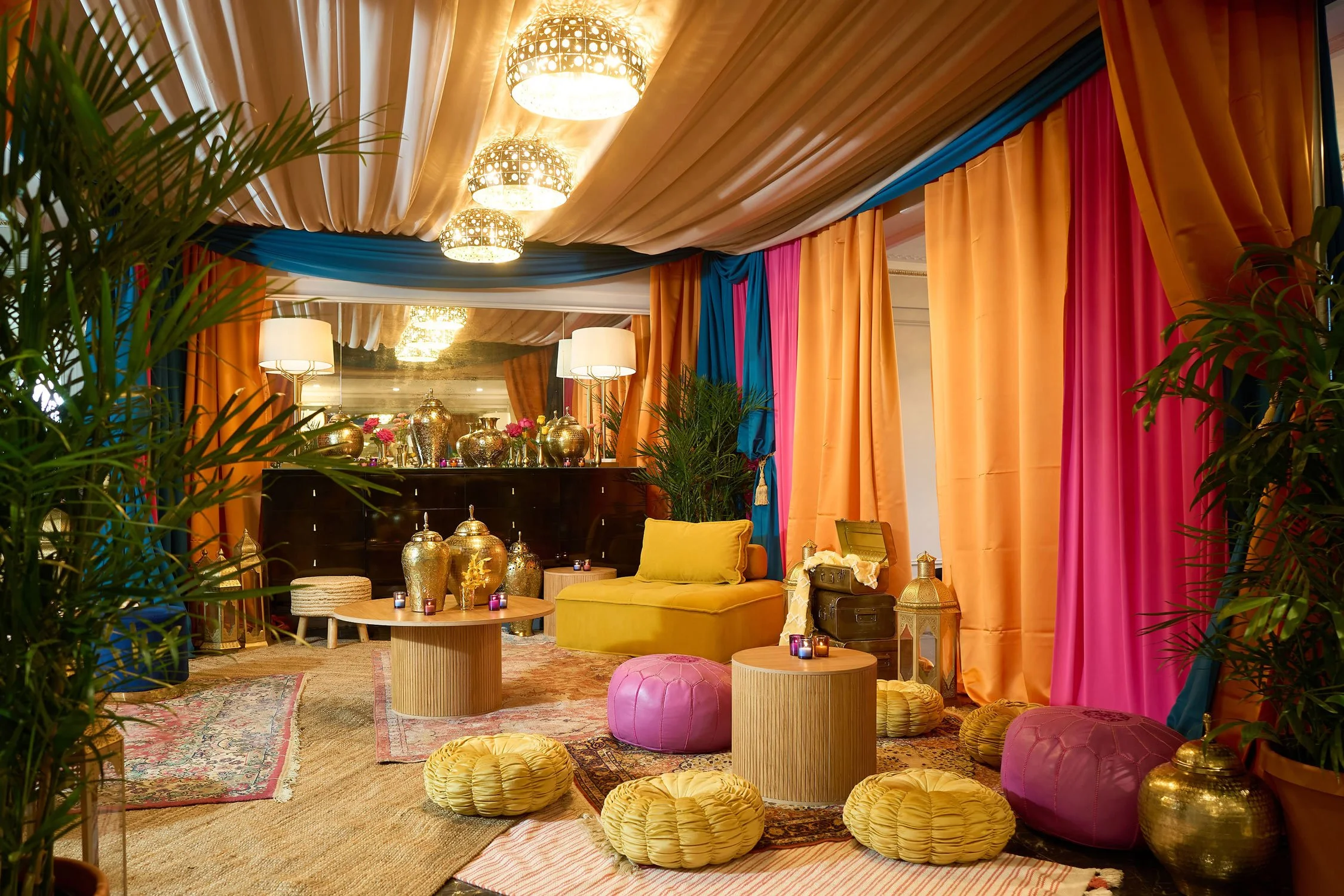 A Moroccan Night Gala began with themed cocktails set in Vanity Fair Ballroom styled with sofas, low ottomans, lanterns, with patterns iconic of a Moroccan Medina. Guests then ascended to a draped tented lounge layered with carpets, gold lanterns, and cushions. And at last its into the Crystal Ballroom to dine beneath an exotic, shimmering tent, spanning the room with the grand crystal chandelier shining above as the evening’s north star. A night of bold colour, lush textures, and unmistakable glamour set the stage for a celebratory night of splendour for this client’s milestone occasion.