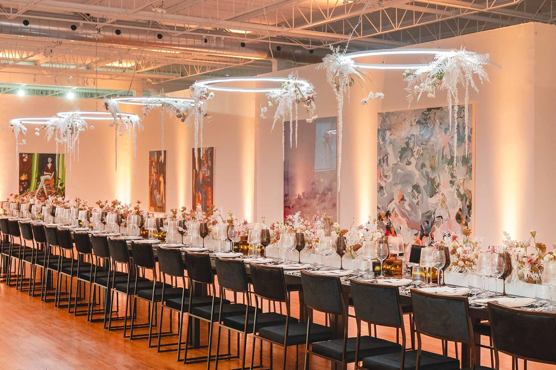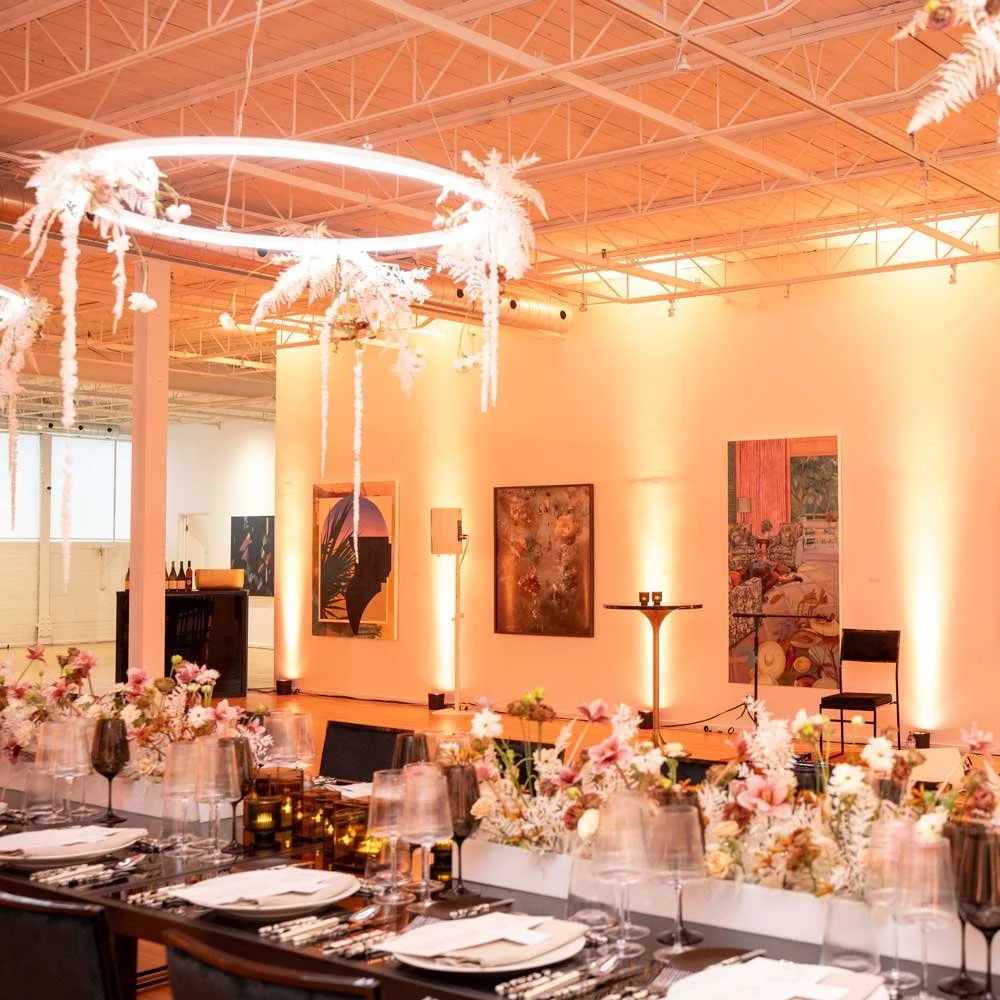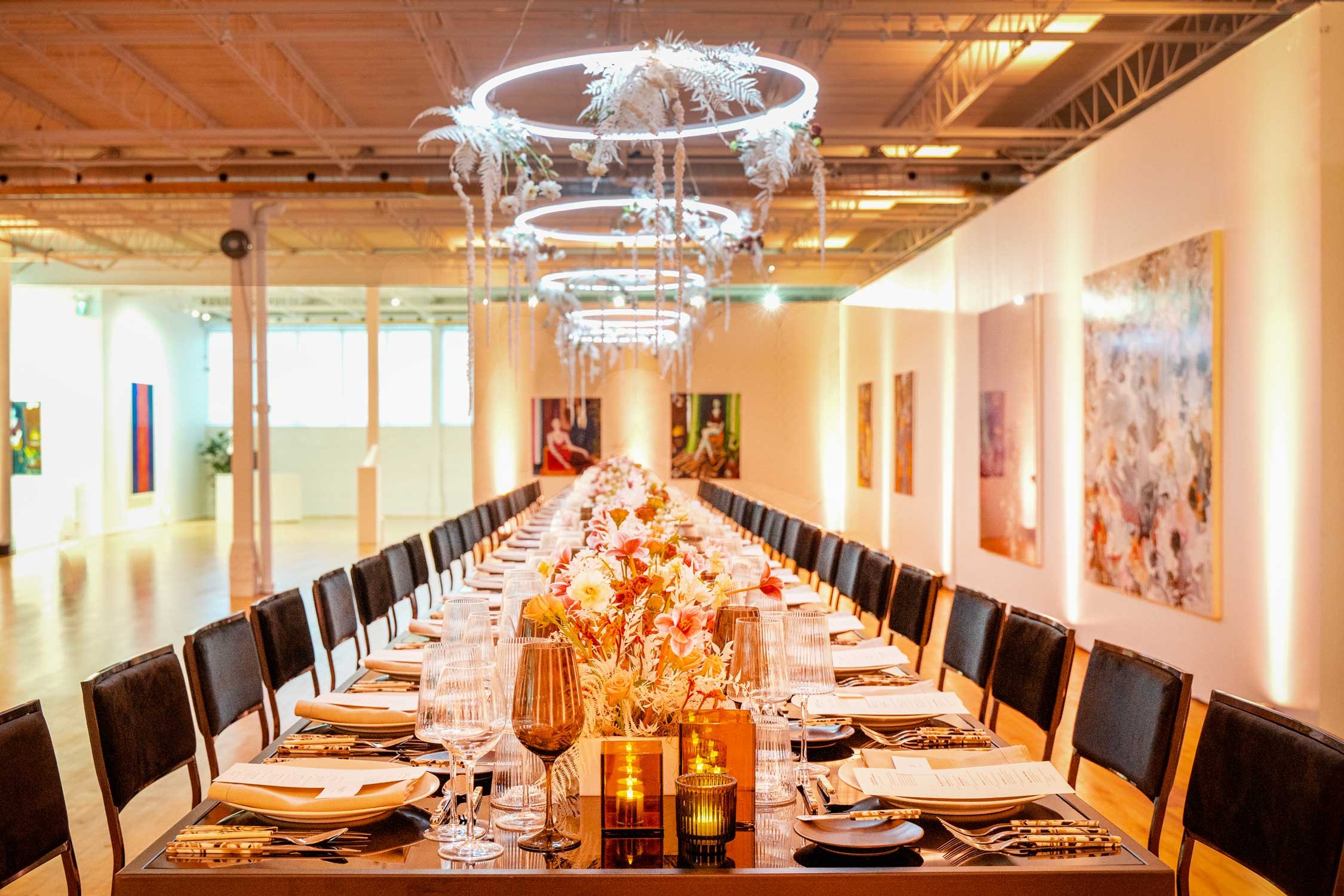 A VIP dinner hosted at the Bau-Xi Gallery paired contemporary art with striking design. It all felt ultra lux as guests dined at a sleek black plexi harvest table beneath the glow of spherical chandeliers. Hedges of blooms, splendid tableware with glowing candlelight softened the modern edge creating creating a setting that felt refined, unexpected, and quietly luxurious.